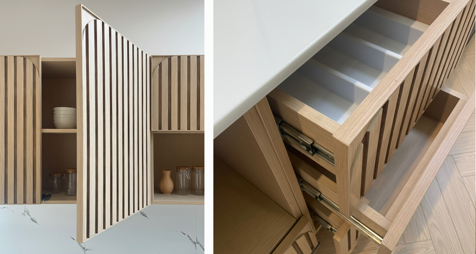 แพนทรี่: เป็นงาน "Dry Process" หรือการประกอบตู้สำเร็จรูป (Modular) สามารถติดตั้งได้รวดเร็วทันใจ จบงานไว เหมาะสำหรับคอนโดหรือบ้านที่ต้องการความสะอาดและไม่รบกวนการอยู่อาศัย