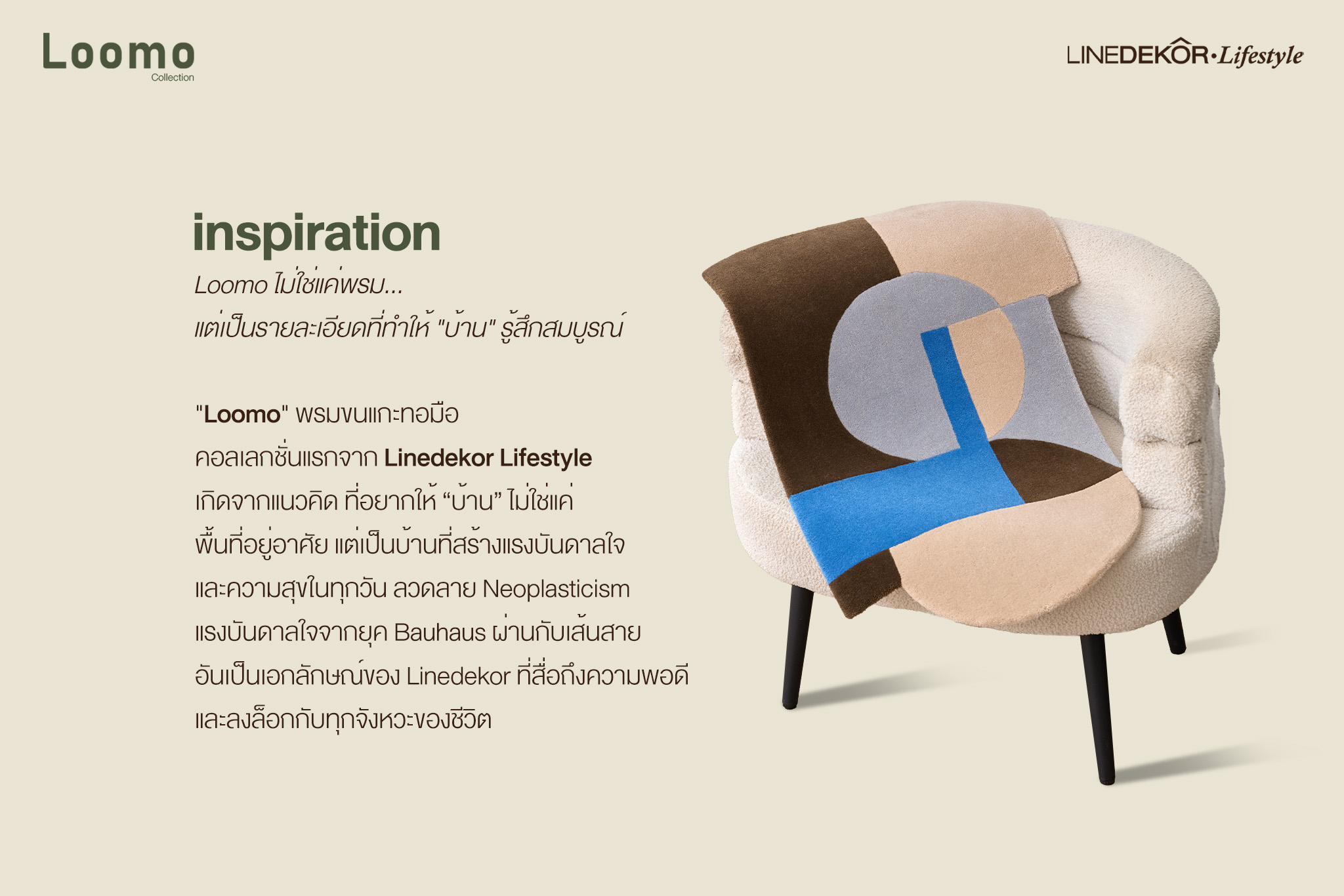 คอลเลกชันแรกจาก Linedekor Lifestyle ภายใต้ชื่อ Loomo เกิดจากแนวคิดที่มุ่งเน้นให้ “บ้าน” ไม่ใช่เพียงแค่พื้นที่อยู่อาศัย แต่เป็นสถานที่ที่เติมเต็มแรงบันดาลใจ ความอบอุ่น และความสุขในทุกวัน ลวดลายของ Loomo ได้รับแรงบันดาลใจจากแนวคิด Neoplasticism ผสมผสานกับจิตวิญญาณแห่งยุค Bauhaus ถ่ายทอดผ่านดีไซน์ที่ทันสมัยและสื่อถึงเอกลักษณ์เฉพาะของแบรนด์ Linedekor