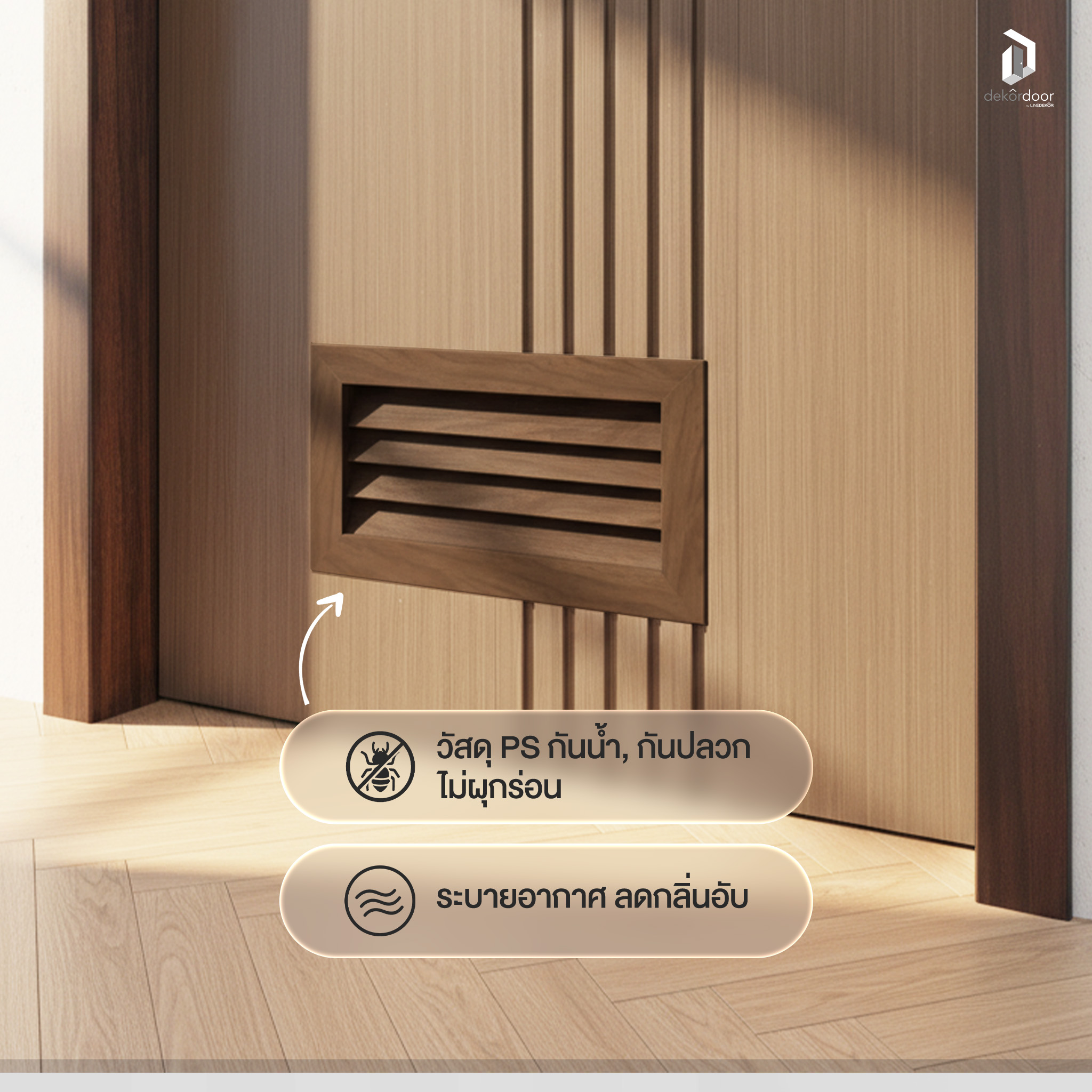จุดเด่นของช่องระบายอากาศ PS ที่ตอบโจทย์บ้านเมืองร้อน หนึ่งในองค์ประกอบที่ทำให้สินค้ารุ่นนี้แตกต่างจากประตูทั่วไปคือ ช่องระบายอากาศ PS ซึ่งถูกออกแบบมาให้ใช้งานร่วมกับบานประตูได้อย่างกลมกลืน ทั้งในแง่ฟังก์ชันและความสวยงาม ช่วยลดความอับชื้นและกลิ่นสะสม ในพื้นที่อย่างห้องน้ำ ห้องแต่งตัว ห้องซักล้าง หรือห้องเก็บของ ปัญหาที่พบบ่อยคืออากาศหมุนเวียนไม่ดี ทำให้เกิดกลิ่นอับ ความชื้นสะสม และความรู้สึกไม่สบายเมื่อใช้งาน ช่องระบายอากาศจึงมีบทบาทสำคัญในการช่วยให้อากาศไหลเวียนดีขึ้น